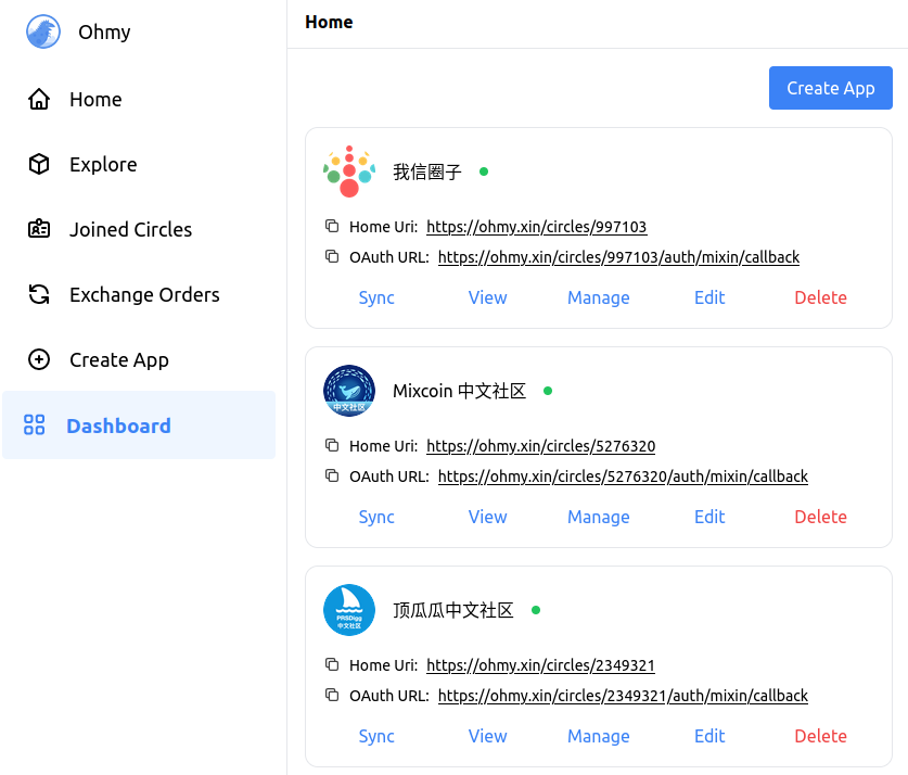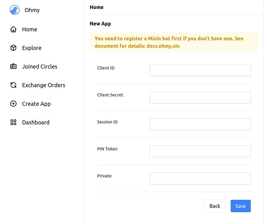 Open https://ohmy.xin, login with Mixin Messenger, and click Create App button on the left sidebar.