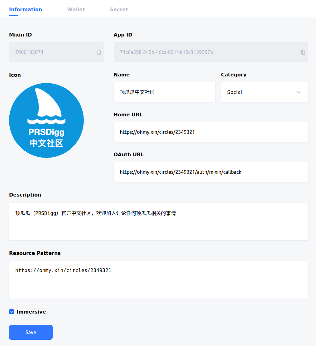 https://mixin.one,后面再修改为我信提供的网址 - 简介的字数限制在 16 ~ 128 个